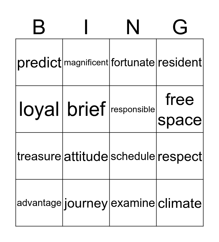 This bingo card has a free space and 17 words: examine, advantage, fortunate, predict, attitude, resident, respect, responsible, free space, brief, journey, climate, loyal, magnificent, treasure, diagram and opposite.