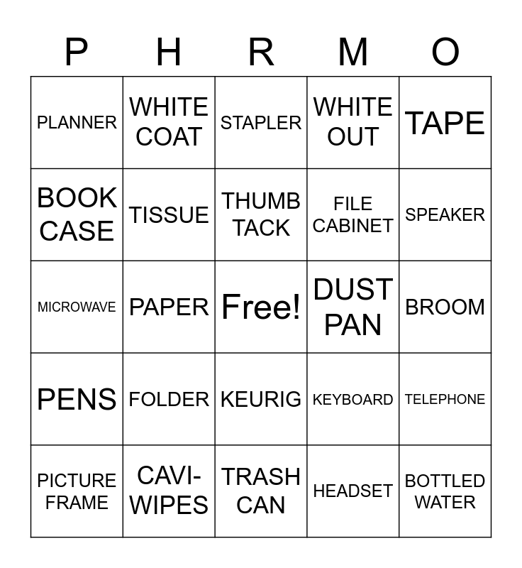 This bingo card has a free space and 40 words: WEDDING PHOTO, MICROWAVE, DRY ERASE BOARD, TISSUE, CAVI-WIPES, KEURIG, THUMB TACK, HAND SANITIZER, TAPE, PENS, PAPER, WHITE OUT, BOTTLED WATER, BROOM, DUST PAN, FOLDER, ORGANIZER, PLANNER, STICKY NOTE, STAPLER, TELEPHONE, HEADSET, FILE CABINET, BOOK CASE, LAPTOP, COFFEE MUG, PRINTER, CALENDAR, RX PAD, CELL PHONE, CELL PHONE CHARGER, PICTURE FRAME, MOUSE, KEYBOARD, SPEAKER, TRASH CAN, UMBRELLA, BOOK, WHITE COAT and DIPLOMA.