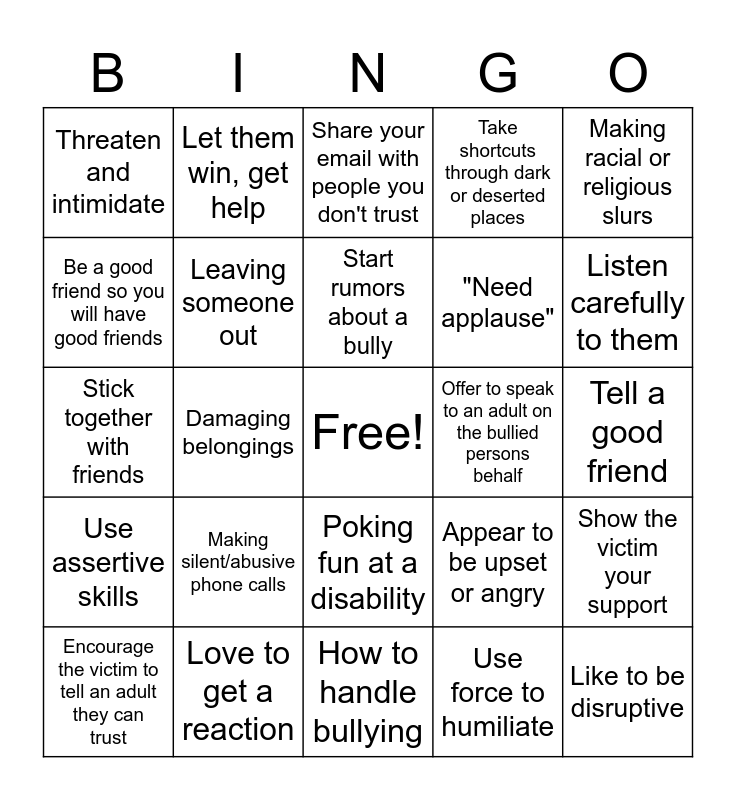 This bingo card has a free space and 24 words: Making silent/abusive phone calls, Love to get a reaction, Start rumors about a bully, Encourage the victim to tell an adult they can trust, Making racial or religious slurs, Threaten and intimidate, Be a good friend so you will have good friends, Let them win, get help, Offer to speak to an adult on the bullied persons behalf, Poking fun at a disability, "Need applause", Stick together with friends, Appear to be upset or angry, Show the victim your support, Leaving someone out, Use force to humiliate, Tell a good friend, Share your email with people you don't trust, Listen carefully to them, Damaging belongings, Like to be disruptive, Use assertive skills, Take shortcuts through dark or deserted places and How to handle bullying.