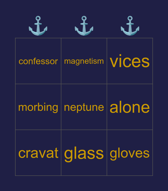 This bingo card has 9 words: cravat, vices, magnetism, morbing, confessor, alone, neptune, gloves and glass.