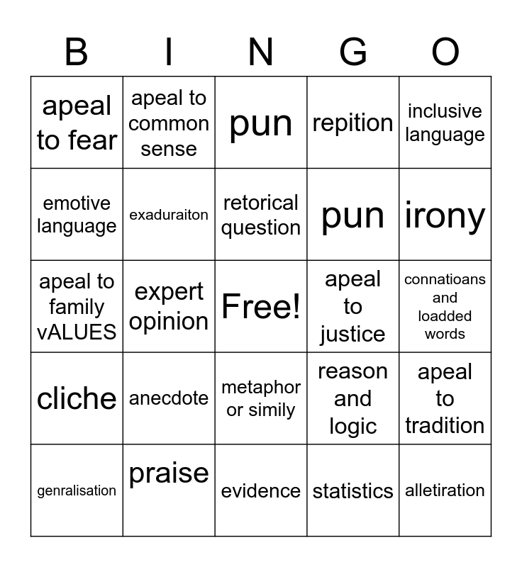 This bingo card has a free space and 30 words: praise, apeal to athority, expert opinion, colorful language, apeal to fear, pun, exaduraiton, metaphor or simily, apeal to justice, evidence, connatioans and loadded words, alletiration, statistics, apeal to hip poket nerve, irony, attack, reason and logic, cliche, anecdote, inclusive language, apeal to family vALUES, the rule of three, apeal to common sense, pun, emotive language, repition, apeal to tradition, genralisation, retorical question and apeal to patriotism.