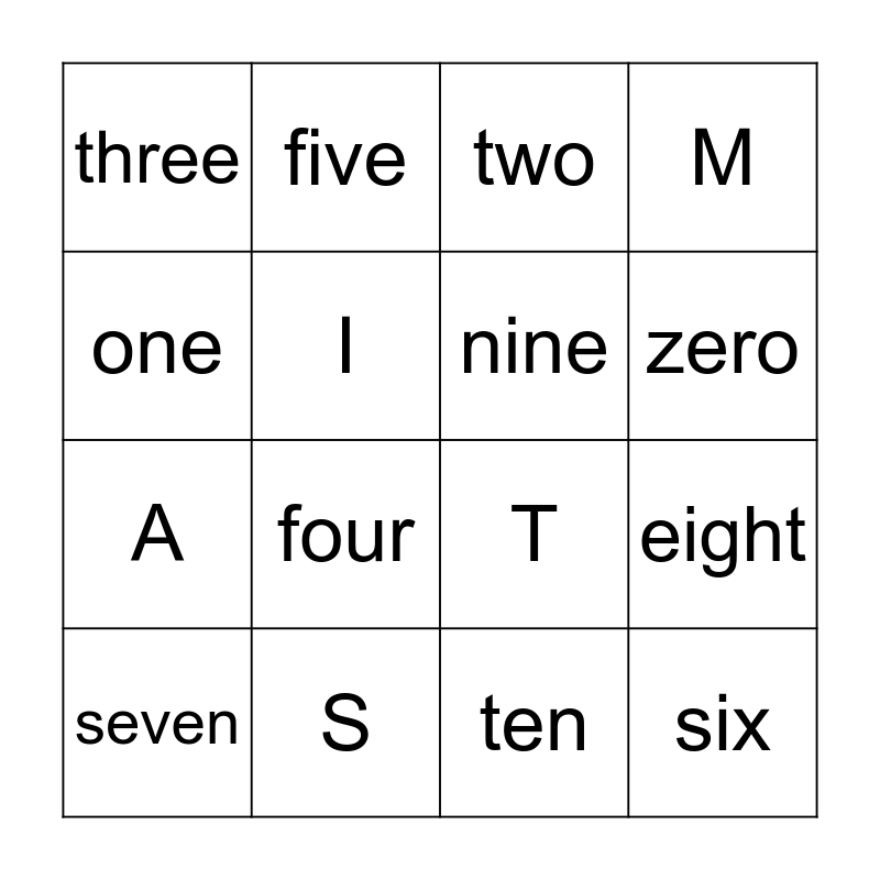This bingo card has 16 words: S, eight, two, three, A, five, T, ten, one, I, seven, M, four, zero, nine and six.