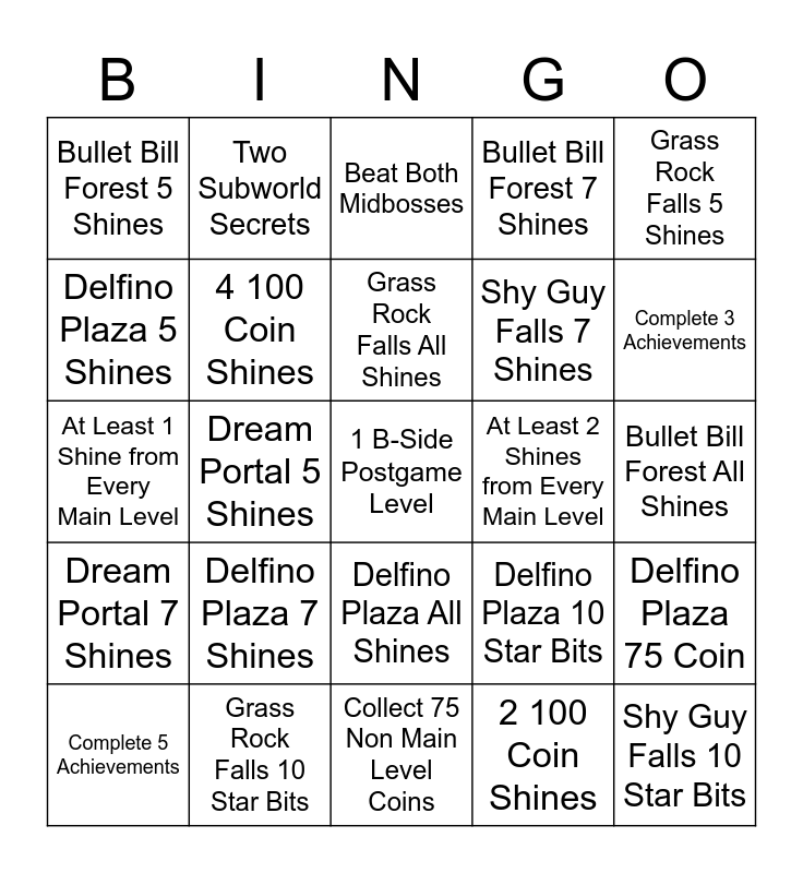 This bingo card has 64 words: Free!, Grass Rock Falls 75 Coin, Shy Guy Falls 75 Coin, Delfino Plaza 75 Coin, Dream Portal 75 Coin, Bullet Bill Forest 75 Coin, Two Subworld Secrets, All Subworld Secrets, Grass Rock Falls All Shines, Shy Guy Falls All Shines, Delfino Plaza All Shines, Dream Portal All Shines, Bullet Bill Forest All Shines, Grass Rock Falls 5 Shines, Shy Guy Falls 5 Shines, Delfino Plaza 5 Shines, Dream Portal 5 Shines, Bullet Bill Forest 5 Shines, Grass Rock Falls 7 Shines, Shy Guy Falls 7 Shines, Delfino Plaza 7 Shines, Dream Portal 7 Shines, Bullet Bill Forest 7 Shines, Grass Rock Falls Red Coins, Shy Guy Falls Red Coins, Delfino Plaza Red Coins, Dream Portal Red Coins, Bullet Bill Forest Red Coins, 2 Red Coin Shines, 3 Red Coin Shines, All Red Coin Shines, Beat the Game with 10 Lives, Beat the Game with 20 Lives, Beat the Game with 30 Lives, Complete 3 Achievements, Complete 5 Achievements, Complete 7 Achievements, 2 100 Coin Shines, 3 100 Coin Shines, 4 100 Coin Shines, At Least 1 Shine from Every Main Level, At Least 2 Shines from Every Main Level, At Least 4 Shines from 3 Levels, At Least 5 Shines from 3 Levels, At Least 3 Shines from 4 Levels, 1 B-Side Postgame Level, Grass Rock Falls 10 Star Bits, Shy Guy Falls 10 Star Bits, Delfino Plaza 10 Star Bits, Dream Portal 10 Star Bits, Bullet Bill Forest 10 Star Bits, ???? 10 Star Bits, Collect 75 Non Main Level Coins, Stomp on 10 NPCs, Stomp on 20 NPCs, Beat Boldergeist/Midbus, Beat Both Midbosses, Collect 40 Shines, Collect 45 Shines, Collect 50 Shines, Collect 85 Coins in 2 Levels, Collect 100 Coins in 1 Level, Collect 100 Coins in 2 Levels and Enter ?????? Stage.