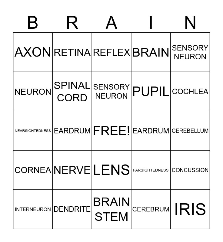 This bingo card has a free space and 24 words: NERVE, DENDRITE, SENSORY NEURON, INTERNEURON, SENSORY NEURON, AXON, NEURON, RETINA, EARDRUM, LENS, PUPIL, NEARSIGHTEDNESS, FARSIGHTEDNESS, CONCUSSION, SPINAL CORD, CEREBRUM, CEREBELLUM, REFLEX, COCHLEA, EARDRUM, IRIS, CORNEA, BRAIN and BRAIN STEM.