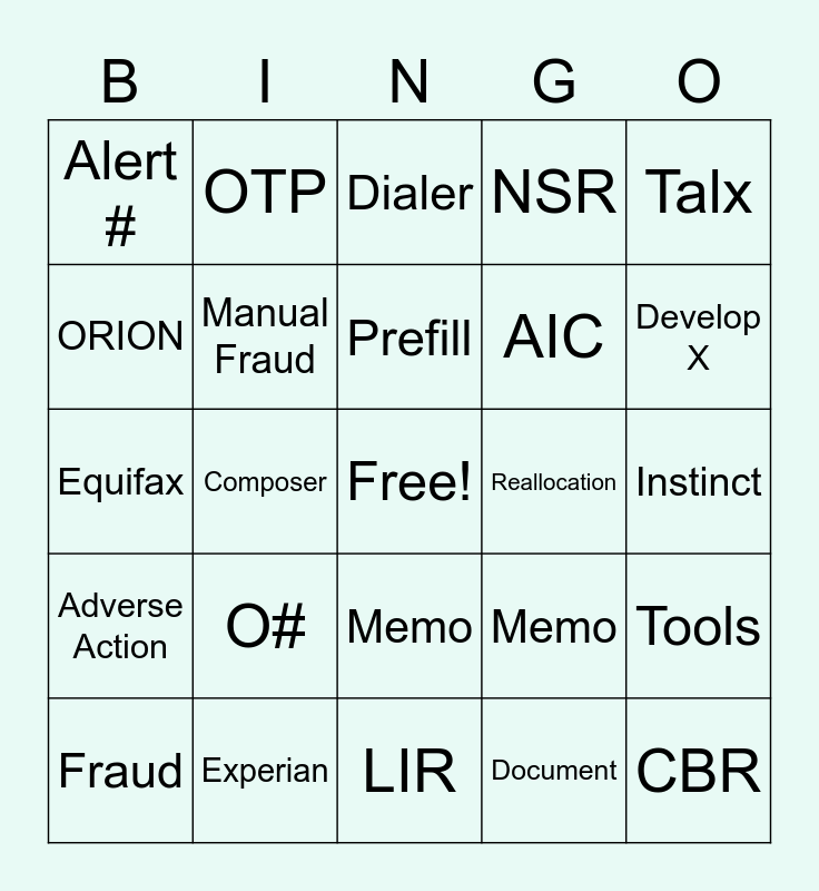 This bingo card has a free space and 29 words: Fraud, Third Party, Composer, CRMA, Alert #, Dialer, Manual Fraud, O#, Reallocation, Experian, Instinct, CBR, LIR, Document, Develop X, Focus, Memo, Adverse Action, Talx, Equifax, Memo, Transunion, AIC, ORION, NSR, OTP, Tools, Prefill and Instant Credit.