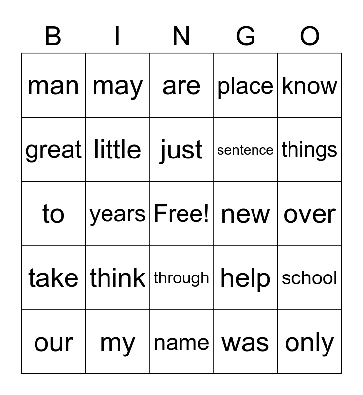 This bingo card has a free space and 39 words: live, sound, work, little, our, through, just, where, know, take, years, place, only, over, new, think, good, man, say, help, great, name, sentence, things, give, very, after, most, back, may, water, you, are, my, was, people, school, to and on.