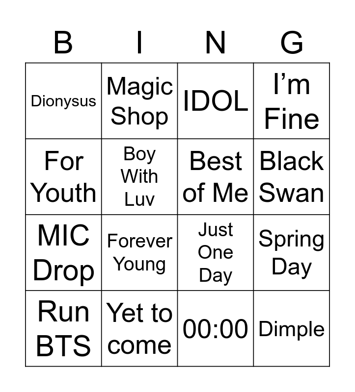 This bingo card has 17 words: Run BTS, Yet to come, IDOL, I’m Fine, MIC Drop, Boy With Luv, Just One Day, Black Swan, For Youth, Forever Young, 00:00, Spring Day, Dionysus, Magic Shop, Best of Me, Dimple and Dis-Ease.