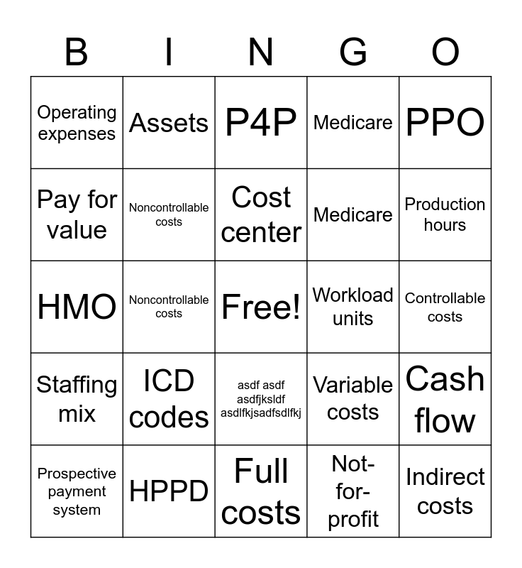 This bingo card has a free space and 89 words: HMO, PPO, asdf asdf asdfjksldf asdlfkjsadfsdlfkj, ACO, Acuity Index, ACA, Assets, Baseline data, Break-even point, Bundled payment, Capitation, Case mix, Cash flow, Controllable costs, Cost-benefit ratio, Cost center, Diagnosis-related groups, Direct costs, FFS, Fixed budget, Fixed cost, For-profit organization, Full costs, Full-time equivalent, HMO, HPPD, ICD codes, Indirect costs, Managed care, Medicaid, Medicare, Noncontrollable costs, Not-for-profit, Operating expenses, Patient classification system, P4P, Pay for value, PPO, Production hours, Prospective payment system, Staffing mix, Third-party payment, Turnover ratio, Value-Based purchasing, Variable costs, Workload units, ACO, Acuity Index, ACA, Assets, Baseline data, Break-even point, Bundled payment, Capitation, Case mix, Cash flow, Controllable costs, Cost-benefit ratio, Cost center, Diagnosis-related groups, Direct costs, FFS, Fixed budget, Fixed cost, For-profit organization, Full costs, Full-time equivalent, HMO, HPPD, ICD codes, Indirect costs, Managed care, Medicaid, Medicare, Noncontrollable costs, Not-for-profit, Operating expenses, Patient classification system, P4P, Pay for value, PPO, Production hours, Prospective payment system, Staffing mix, Third-party payment, Turnover ratio, Value-Based purchasing, Variable costs and Workload units.