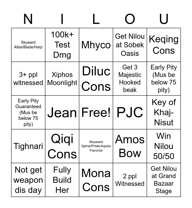 This bingo card has a free space and 24 words: Qiqi Cons, Fully Build Her, Diluc Cons, Not get weapon dis day, Keqing Cons, Skyward Atlas/Blade/Harp, 3+ ppl witnessed, 100k+ Test Dmg, PJC, Skyward Spine/Pride/Aquila Favonia, Get 3 Majestic Hooked beak, Early Pity Guaranteed (Mus be below 75 pity), Amos Bow, Win Nilou 50/50, Xiphos Moonlight, 2 ppl Witnessed, Key of Khaj-Nisut, Mhyco, Early Pity (Mus be below 75 pity), Jean, Get Nilou at Grand Bazaar Stage, Tighnari, Get Nilou at Sobek Oasis and Mona Cons.