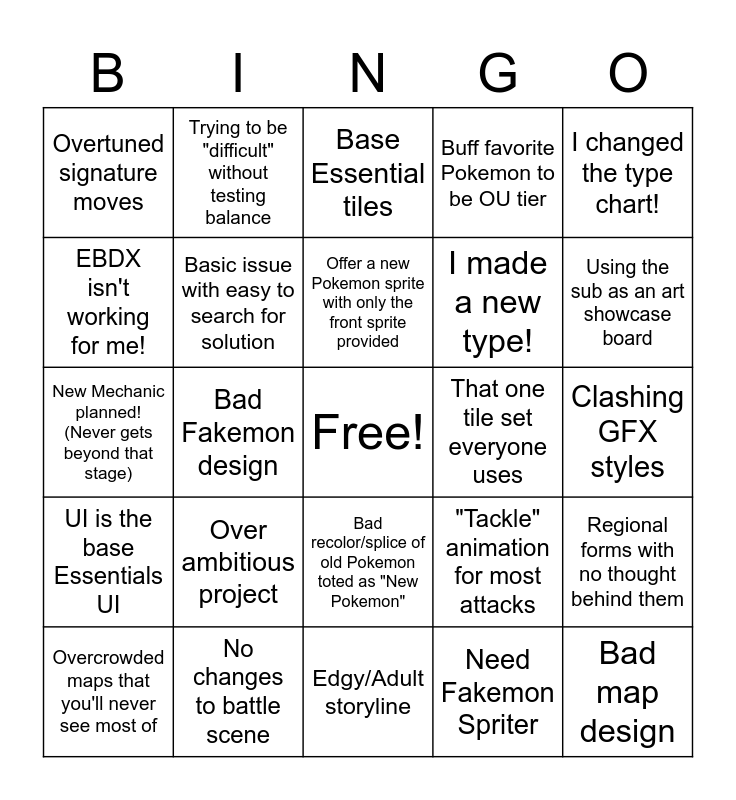 This bingo card has a free space and 24 words: Over ambitious project, No changes to battle scene, Offer a new Pokemon sprite with only the front sprite provided, Overcrowded maps that you'll never see most of, I changed the type chart!, Overtuned signature moves, EBDX isn't working for me!, Trying to be "difficult" without testing balance, That one tile set everyone uses, Bad recolor/splice of old Pokemon toted as "New Pokemon", I made a new type!, New Mechanic planned! (Never gets beyond that stage), "Tackle" animation for most attacks, Regional forms with no thought behind them, Basic issue with easy to search for solution, Need Fakemon Spriter, Clashing GFX styles, Base Essential tiles, Using the sub as an art showcase board, Bad Fakemon design, Bad map design, UI is the base Essentials UI, Buff favorite Pokemon to be OU tier and Edgy/Adult storyline.