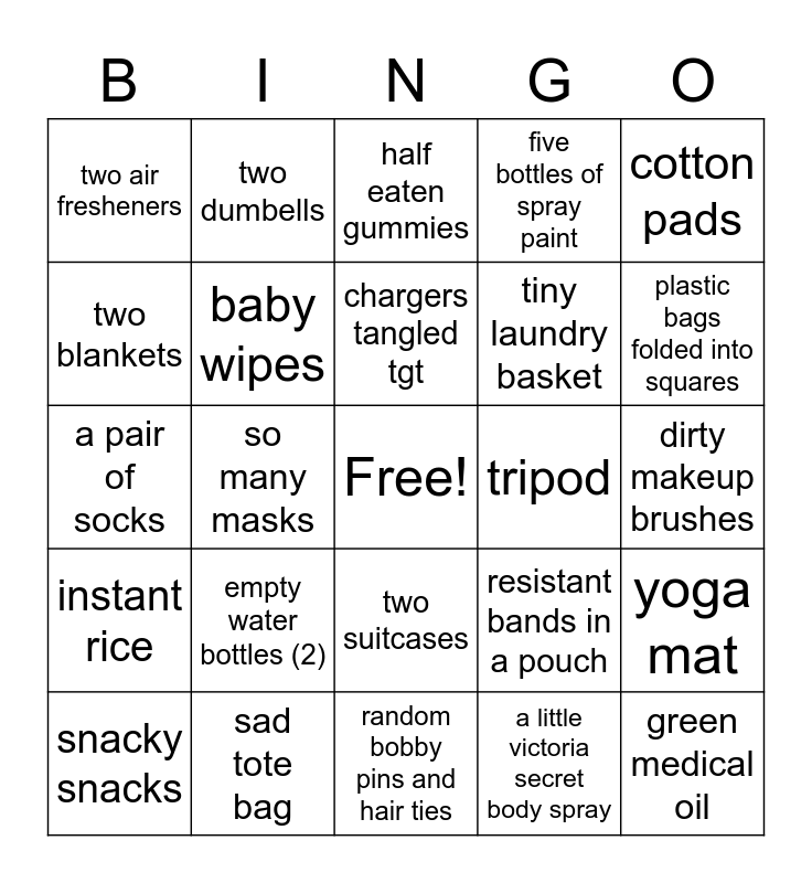 This bingo card has a free space and 24 words: empty water bottles (2), sad tote bag, chargers tangled tgt, snacky snacks, cotton pads, two air fresheners, two blankets, two dumbells, tripod, two suitcases, tiny laundry basket, a pair of socks, resistant bands in a pouch, yoga mat, baby wipes, a little victoria secret body spray, dirty makeup brushes, half eaten gummies, plastic bags folded into squares, so many masks, green medical oil, instant rice, five bottles of spray paint and random bobby pins and hair ties.