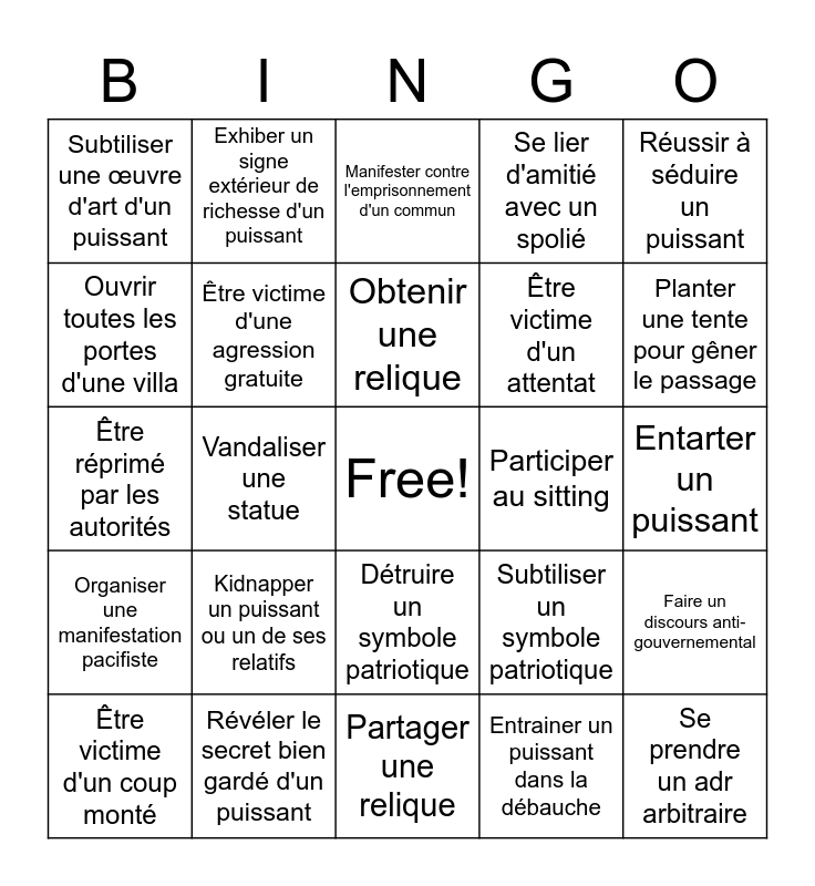 This bingo card has a free space and 24 words: Kidnapper un puissant ou un de ses relatifs, Révéler le secret bien gardé d'un puissant, Obtenir une relique, Être victime d'un coup monté, Réussir à séduire un puissant, Subtiliser une œuvre d'art d'un puissant, Ouvrir toutes les portes d'une villa, Exhiber un signe extérieur de richesse d'un puissant, Participer au sitting, Détruire un symbole patriotique, Être victime d'un attentat, Être réprimé par les autorités, Subtiliser un symbole patriotique, Faire un discours anti-gouvernemental, Être victime d'une agression gratuite, Entrainer un puissant dans la débauche, Entarter un puissant, Manifester contre l'emprisonnement d'un commun, Planter une tente pour gêner le passage, Vandaliser une statue, Se prendre un adr arbitraire, Organiser une manifestation pacifiste, Se lier d'amitié avec un spolié and Partager une relique.