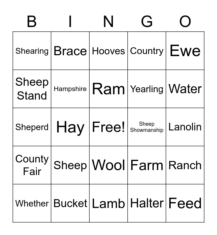 This bingo card has a free space and 25 words: Sheep, Lamb, Ram, Whether, Ewe, Shearing, Sheep Stand, Brace, Sheep Showmanship, Wool, Yearling, Sheperd, Farm, Ranch, Hampshire, Suffolk, Lanolin, Hooves, Water, Hay, Feed, Bucket, County Fair, Country and Halter.