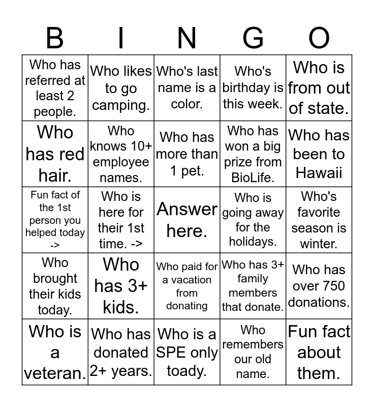 This bingo card has a free space and 24 words: Who has 3+ kids., Who has donated 2+ years., Who has more than 1 pet., Who is a veteran., Who is from out of state., Who has referred at least 2 people., Who has red hair., Who likes to go camping., Who is going away for the holidays., Who paid for a vacation from donating, Who has won a big prize from BioLife., Fun fact of the 1st person you helped today ->, Who has 3+ family members that donate., Who has over 750 donations., Who knows 10+ employee names., Who remembers our old name., Who's favorite season is winter., Who's last name is a color., Who has been to Hawaii, Who is here for their 1st time. ->, Fun fact about them., Who brought their kids today., Who's birthday is this week. and Who is a SPE only toady..