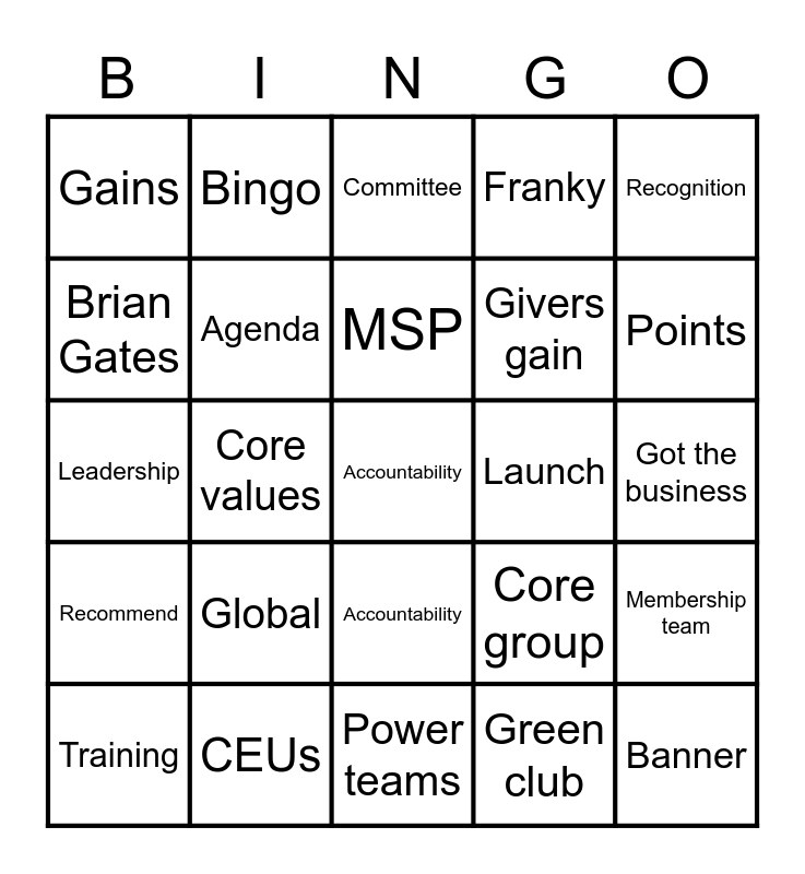 This bingo card has 1 images and 94 words: BNI, Networking, Green club, Traffic lights, Referral, One-to-one, Magic mushroom, CEUs, Business builder, Chapter, Super sub, Testimonial, MSP, Visitor, Gains, Points, Podcast, A2Z, Coastal, Integrity, B4B, Spirit of Business, Fusion, Franky, Brian Gates, Generate, Givers gain, Connect, Invite, Global, Ivan Misner, Building relationships, Skills, Training, Socials, Power teams, Success, Leadership, President, Membership team, Core values, Accountability, Recognition, Core group, Launch, Ambassador, Passport, Treasurer, Presentation, Breakfast, Pay to play, Banner, Education slot, TYFTB, Announcements, Business card, Region, Local, Bio, Agenda, Growth, Iceni, Chelmsford Central, Chelmsford Capital, Fantasia, Foundation, Join, Committee, Mentor, Traditions and innovation, Lifelong learning, Accountability, Positive attitude, Vision, Speaker, Top table, Pizza, Heidi’s, Bingo, Sausage, Friends, Clapping, Frog, Got the business, Recommend, Slips, Closing quote, Social media, Workshop, Face 2 face, Ray Snow, Roller shutter, Lemon and Plonker.