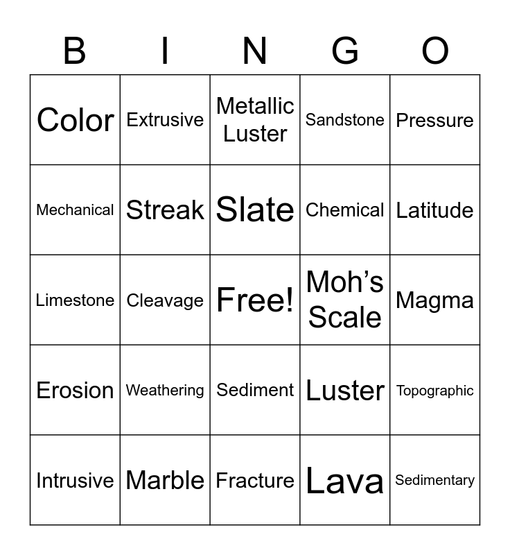 This bingo card has a free space and 31 words: Fracture, Hardness, Cleavage, Nonmetallic Luster, Color, Metallic Luster, Streak, Luster, Moh’s Scale, Lava, Magma, Sedimentary, Metamorphic, Igneous, Latitude, Longitude, Topographic, Weathering, Erosion, Sediment, Pressure, Temperature, Intrusive, Extrusive, Chemical, Mechanical, Sandstone, Limestone, Marble, Slate and Obsidian.