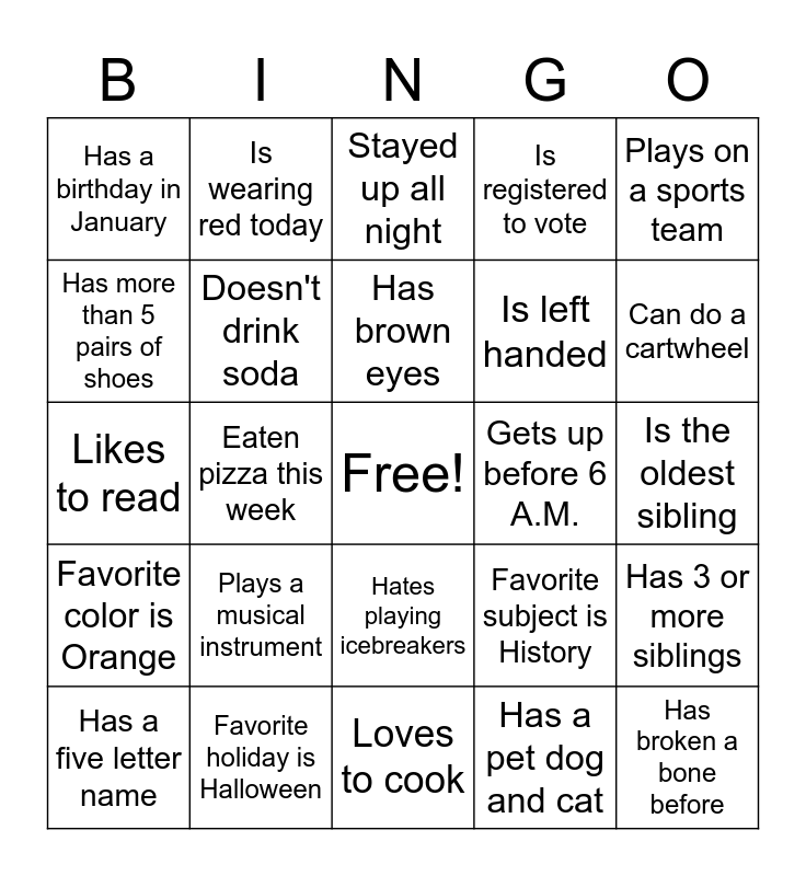 This bingo card has a free space and 24 words: Plays a musical instrument, Favorite holiday is Halloween, Has brown eyes, Has a five letter name, Plays on a sports team, Has a birthday in January, Has more than 5 pairs of shoes, Is wearing red today, Gets up before 6 A.M., Hates playing icebreakers, Is left handed, Likes to read, Favorite subject is History, Has 3 or more siblings, Doesn't drink soda, Has a pet dog and cat, Is the oldest sibling, Stayed up all night, Can do a cartwheel, Eaten pizza this week, Has broken a bone before, Favorite color is Orange, Is registered to vote and Loves to cook.