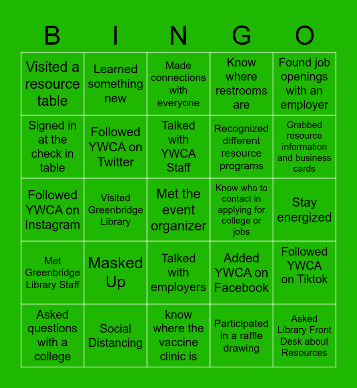 This bingo card has a free space and 24 words: Masked Up, Social Distancing, Talked with YWCA Staff, Asked questions with a college, Found job openings with an employer, Visited a resource table, Signed in at the check in table, Learned something new, Know who to contact in applying for college or jobs, Talked with employers, Recognized different resource programs, Followed YWCA on Instagram, Added YWCA on Facebook, Followed YWCA on Tiktok, Followed YWCA on Twitter, Participated in a raffle drawing, Stay energized, Made connections with everyone, Grabbed resource information and business cards, Visited Greenbridge Library, Asked Library Front Desk about Resources, Met Greenbridge Library Staff, Know where restrooms are and know where the vaccine clinic is.