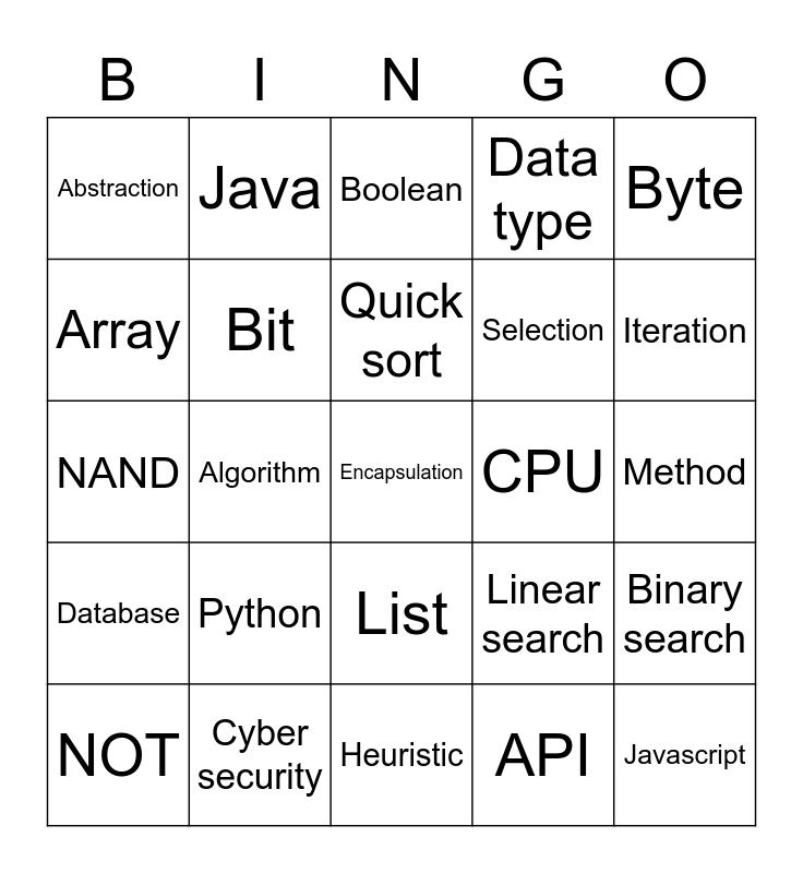 This bingo card has 50 words: Instantiation, Encapsulation, Finite state machine, Heuristic, Python, Binary, Java, Foreign key, Array, C, Bit, Data type, Binary search, Linear search, Bubble sort, Merge sort, Quick sort, CPU, RAM, Byte, Algorithm, API, Abstraction, Selection, Sequence, Javascript, Iteration, ROM, Boolean, List, IDE, Syntax, Agile, Big data, Cyber security, Attribute, Variable, Class, Object, Method, Function, AI, OR, AND, NOT, NAND, Assembly, Complexity, Database and Graph.