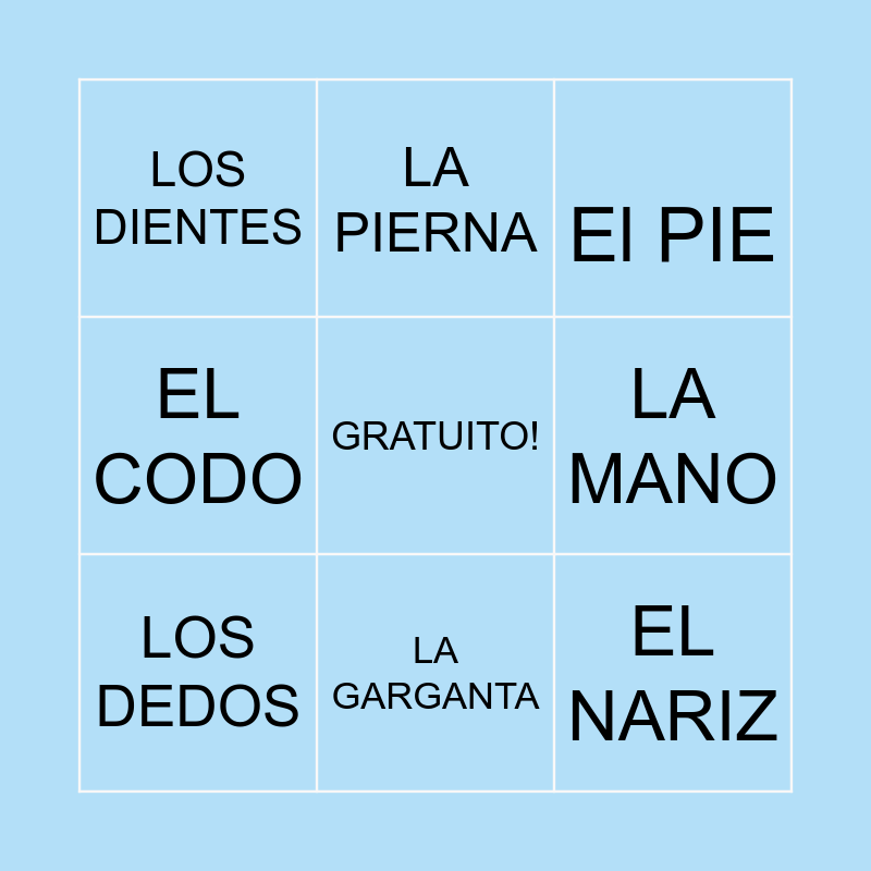This bingo card has a free space and 8 words: LA MANO, El PIE, LA PIERNA, LOS DEDOS, LOS DIENTES, EL NARIZ, EL CODO and LA GARGANTA.