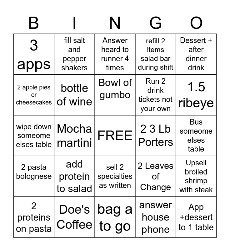 This bingo card has a free space and 24 words: add protein to salad, Doe's Coffee, Bowl of gumbo, 2 proteins on pasta, Dessert + after dinner drink, 3 apps, 2 apple pies or cheesecakes, fill salt and pepper shakers, 2 3 Lb Porters, sell 2 specialties as written, Run 2 drink tickets not your own, wipe down someome elses table, 2 Leaves of Change, Upsell broiled shrimp with steak, bottle of wine, answer house phone, Bus someome elses table, Answer heard to runner 4 times, 1.5 ribeye, Mocha martini, App +dessert to 1 table, 2 pasta bolognese, refill 2 items salad bar during shift and bag a to go.