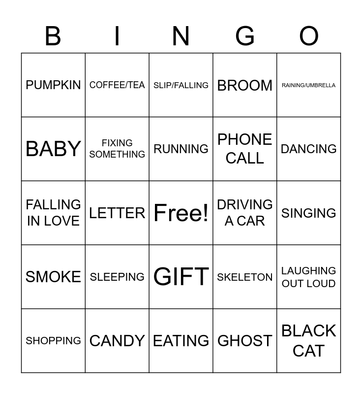 This bingo card has a free space and 25 words: SLEEPING, EATING, RUNNING, SHOPPING, RAINING/UMBRELLA, PUMPKIN, BABY, COFFEE/TEA, DRIVING A CAR, GIFT, PHONE CALL, FALLING IN LOVE, SKELETON, LAUGHING OUT LOUD, FIXING SOMETHING, CRYING, SINGING, SLIP/FALLING, DANCING, LETTER, BLACK CAT, CANDY, SMOKE, BROOM and GHOST.