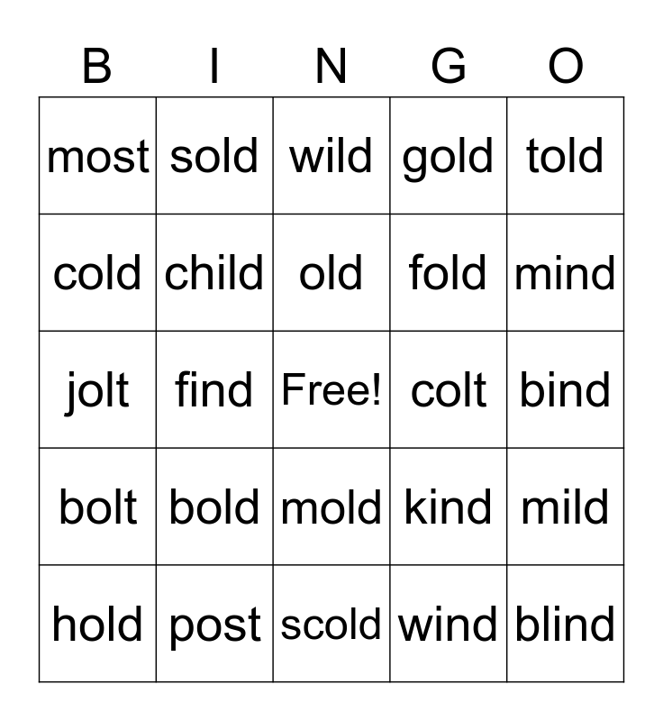 This bingo card has a free space and 24 words: bold, post, old, hold, told, most, cold, sold, colt, mold, fold, jolt, kind, mild, child, wind, bind, wild, mind, find, blind, bolt, gold and scold.
