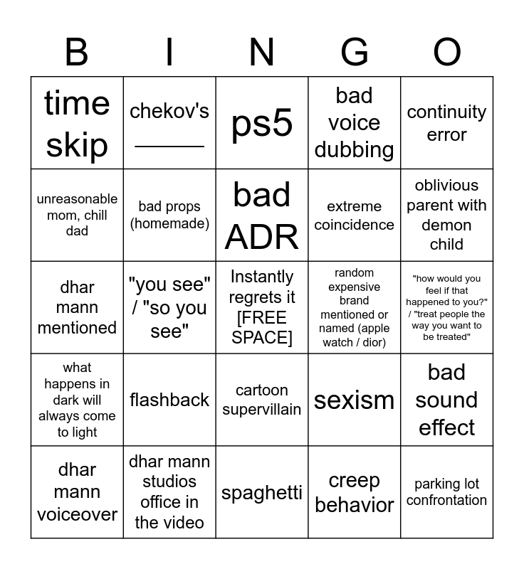 This bingo card has a free space and 29 words: dhar mann voiceover, dhar car, "you see" / "so you see", merch in video, time skip, ps5, bad props (homemade), flashback, random expensive brand mentioned or named (apple watch / dior), dhar mann studios office in the video, "how would you feel if that happened to you?" / "treat people the way you want to be treated", parking lot confrontation, spaghetti, creep behavior, oblivious parent with demon child, kids with ipad, cartoon supervillain, what happens in dark will always come to light, continuity error, dhar mann mentioned, sexism, someone fired over something small, extreme coincidence, unreasonable mom, chill dad, bad voice dubbing, chekov's ______, bad sound effect, bad ADR and bad green screen.