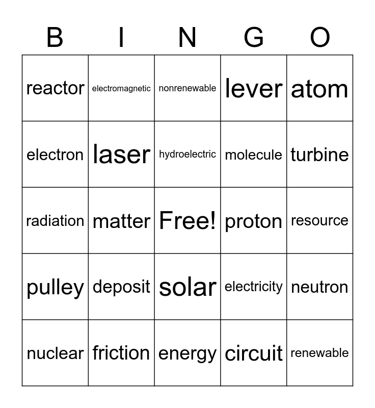 This bingo card has a free space and 25 words: deposit, energy, hydroelectric, nuclear, atom, reactor, electron, electromagnetic, proton, solar, molecule, radiation, electricity, neutron, laser, anthracite, resource, nonrenewable, turbine, matter, renewable, friction, pulley, lever and circuit.