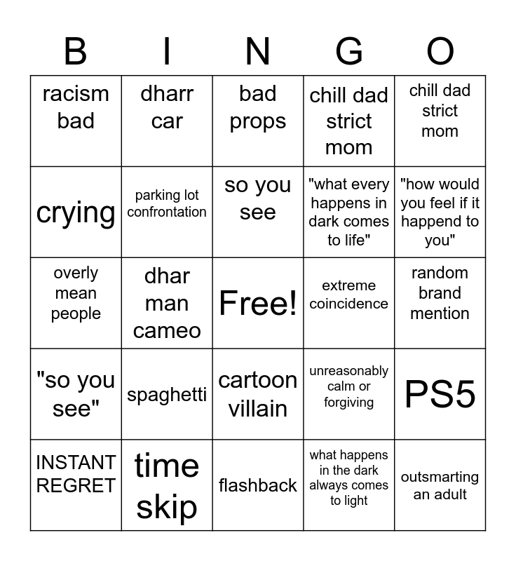 This bingo card has a free space and 24 words: INSTANT REGRET, spaghetti, so you see, what happens in the dark always comes to light, chill dad strict mom, racism bad, dharr car, bad props, extreme coincidence, random brand mention, overly mean people, parking lot confrontation, unreasonably calm or forgiving, PS5, crying, time skip, flashback, chill dad strict mom, "how would you feel if it happend to you", "so you see", dhar man cameo, cartoon villain, "what every happens in dark comes to life" and outsmarting an adult.