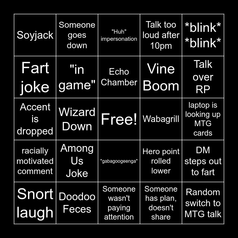 This bingo card has a free space and 24 words: Among Us Joke, Doodoo Feces, Echo Chamber, Snort laugh, *blink* *blink*, Soyjack, Fart joke, Someone goes down, Wabagrill, "gabagoogeenga", Vine Boom, Accent is dropped, Hero point rolled lower, DM steps out to fart, "in game", Someone has plan, doesn't share, laptop is looking up MTG cards, "Huh" impersonation, Talk over RP, Wizard Down, Random switch to MTG talk, racially motivated comment, Talk too loud after 10pm and Someone wasn't paying attention.