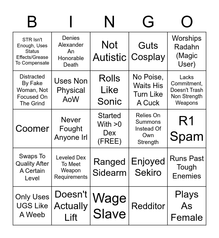 This bingo card has a free space and 24 words: Leveled Dex To Meet Weapon Requirements, Doesn't Actually Lift, Rolls Like Sonic, Only Uses UGS Like A Weeb, Worships Radahn (Magic User), STR Isn't Enough, Uses Status Effects/Grease To Compensate, Distracted By Fake Woman, Not Focused On The Grind, Denies Alexander An Honorable Death, Relies On Summons Instead Of Own Strength, Ranged Sidearm, No Poise, Waits His Turn Like A Cuck, Coomer, Enjoyed Sekiro, Runs Past Tough Enemies, Uses Non Physical AoW, Redditor, R1 Spam, Not Autistic, Lacks Commitment, Doesn't Trash Non Strength Weapons, Never Fought Anyone Irl, Plays As Female, Swaps To Quality After A Certain Level, Guts Cosplay and Wage Slave.
