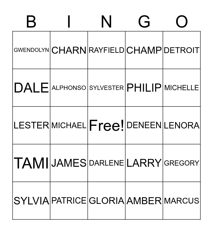 This bingo card has a free space and 25 words: JAMES, GLORIA, SYLVESTER, SYLVIA, DETROIT, GWENDOLYN, DALE, CHARN, DENEEN, DARLENE, PHILIP, LESTER, LARRY, GREGORY, ALPHONSO, DEORAH, LENORA, RAYFIELD, MICHELLE, MICHAEL, MARCUS, PATRICE, TAMI, CHAMP and AMBER.