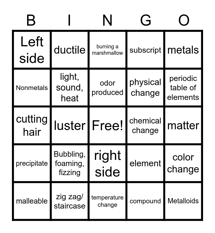 This bingo card has a free space and 24 words: Bubbling, foaming, fizzing, zig zag/ staircase, odor produced, malleable, metals, Left side, Nonmetals, ductile, chemical change, right side, physical change, cutting hair, element, color change, light, sound, heat, compound, matter, burning a marshmallow, periodic table of elements, luster, Metalloids, precipitate, subscript and temperature change.