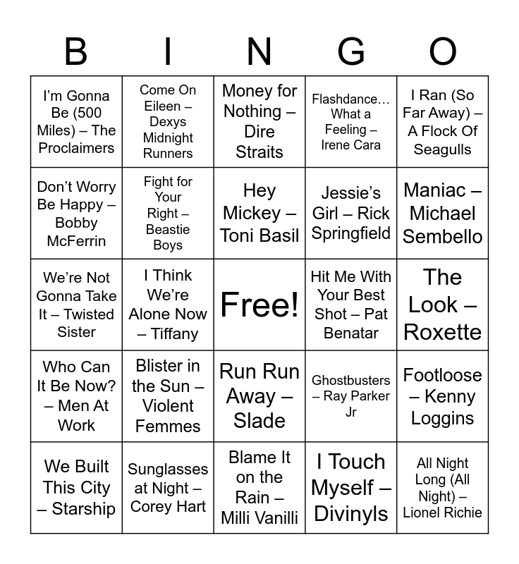 This bingo card has a free space and 50 words: (I’ve Had) The Time of My Life – Bill Medley, Jennifer Warnes, All Night Long (All Night) – Lionel Richie, Billie Jean – Michael Jackson, Blame It on the Rain – Milli Vanilli, Blister in the Sun – Violent Femmes, Cold as Ice – Foreigner, Come On Eileen – Dexys Midnight Runners, Cruel Summer – Bananarama, Don’t Worry Be Happy – Bobby McFerrin, Fame – Irene Cara, Fight for Your Right – Beastie Boys, Flashdance…What a Feeling – Irene Cara, Footloose – Kenny Loggins, Ghostbusters – Ray Parker Jr, Head Over Heels – The Go-Go’s, Heaven is a Place on Earth – Belinda Carlisle, Hey Mickey – Toni Basil, Hit Me With Your Best Shot – Pat Benatar, I Need a Lover – John Mellencamp, I Ran (So Far Away) – A Flock Of Seagulls, I Think We’re Alone Now – Tiffany, I Touch Myself – Divinyls, I’m Gonna Be (500 Miles) – The Proclaimers, Jessie’s Girl – Rick Springfield, Karma Chameleon – Culture Club, Let’s Hear it for the Boy – Deniece Williams, Maniac – Michael Sembello, Material Girl – Madonna, Money for Nothing – Dire Straits, Run Run Away – Slade, Safety Dance – Men Without Hats, Shout – Tears for Fears, Simply Irresistible – Robert Palmer, Summer of ’69 – Bryan Adams, Sunglasses at Night – Corey Hart, Sweet Dreams (Are Made of This) – Eurythmics, Take on Me – A-ha, The Boys of Summer – Don Henley, The Final Countdown – Europe, The Look – Roxette, Total Eclipse of the Heart – Bonnie Tyler, Video Killed the Radio Star – The Buggles, Wake Me Up Before You Go-Go – Wham!, Walk Like an Egyptian – The Bangles, We Built This City – Starship, We’re Not Gonna Take It – Twisted Sister, What’s Love Got to Do with It – Tina Turner, When Doves Cry – Prince, Who Can It Be Now? – Men At Work and Working for the Weekend – Loverboy.