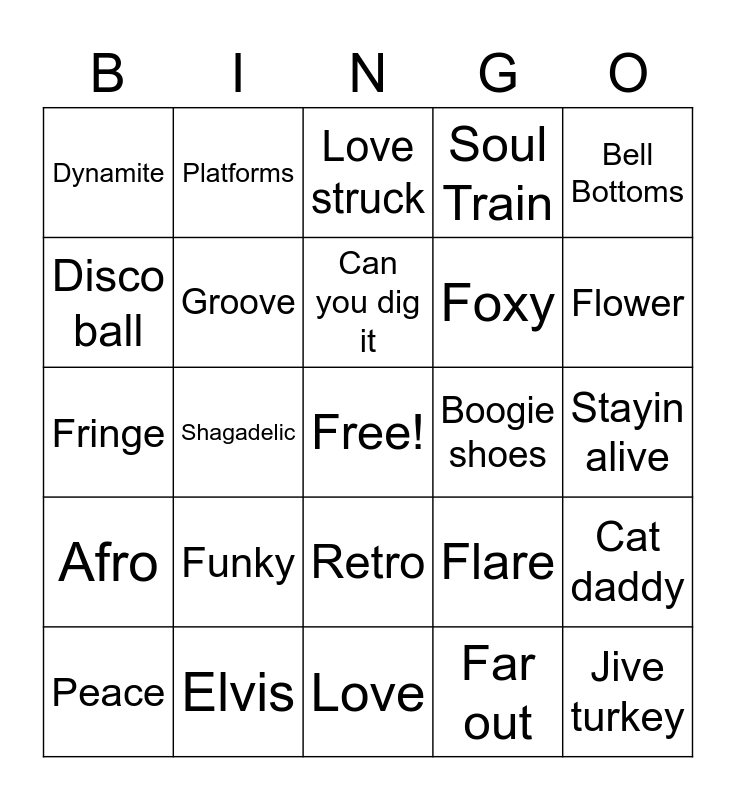This bingo card has a free space and 24 words: Funky, Elvis, Can you dig it, Peace, Bell Bottoms, Dynamite, Disco ball, Platforms, Boogie shoes, Retro, Foxy, Fringe, Flare, Cat daddy, Groove, Far out, Stayin alive, Love struck, Flower, Shagadelic, Jive turkey, Afro, Soul Train and Love.
