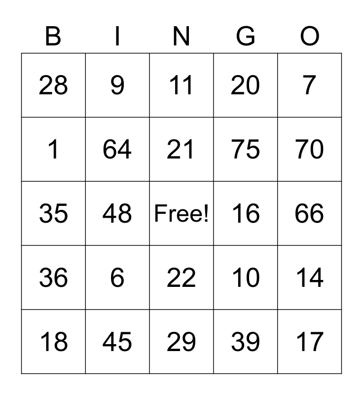 This bingo card has a free space and 24 words: 6, 45, 21, 18, 7, 28, 1, 9, 16, 22, 75, 35, 10, 14, 64, 39, 66, 11, 70, 48, 17, 36, 20 and 29.