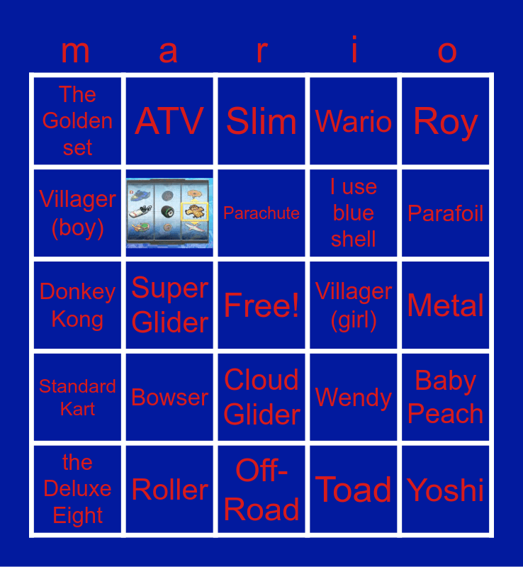This bingo card has 1 images, a free space and 34 words: Mario, Mii, Shy Guy, Wario, Baby Peach, Donkey Kong, Using a Bike, I use blue shell, Luigi, Standard Kart, ATV, Hot Monster, Wood, The Golden set, Bowser, Off-Road, Villager (girl), Metal, the Deluxe Eight, Roller, Slim, Toad, Yoshi, Villager (boy), Super Glider, Cloud Glider, Wario Wing, Parafoil, MKTV Parafoil, Waddle Wing, Parachute, Wendy, Roy and Pink Gold Peach.