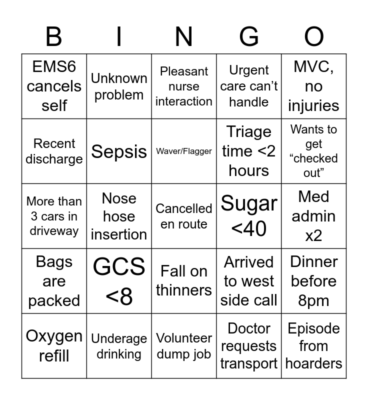 This bingo card has a free space and 24 words: GCS <8, Underage drinking, Waver/Flagger, Oxygen refill, MVC, no injuries, EMS6 cancels self, Recent discharge, Unknown problem, Sugar <40, Fall on thinners, Triage time <2 hours, More than 3 cars in driveway, Arrived to west side call, Dinner before 8pm, Sepsis, Doctor requests transport, Med admin x2, Pleasant nurse interaction, Wants to get “checked out”, Nose hose insertion, Episode from hoarders, Bags are packed, Urgent care can’t handle and Volunteer dump job.