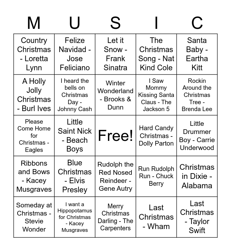 This bingo card has a free space and 52 words: Christmas - Darlene Love, Blue Christmas - Elvis Presley, Do They know it's Christmas - Band Aid, Last Christmas - Wham, Rockin Around the Christmas Tree - Brenda Lee, White Christmas - Bing Crosby, Felize Navidad - Jose Feliciano, It's Beginning to look a lot like Christmas - Michael Buble, The Christmas Song - Nat Kind Cole, All I want for Christmas is You - Mariah Carey, A Holly Jolly Christmas - Burl Ives, Santa Tell Me - Ariana Grande, The Little Drummer Boy - Bing Crosby, Run Rudolph Run - Chuck Berry, Step Into Christmas - Elton John, Sleigh Ride - The Ronettes, Little Saint Nick - Beach Boys, Merry Christmas Darling - The Carpenters, Silent Night - The Temptations, Santa Baby - Eartha Kitt, Please Come Home for Christmas - Eagles, Baby Its Cold Outside - Idina Menzel, Let it Snow - Frank Sinatra, I Saw Mommy Kissing Santa Claus - The Jackson 5, Jingle Bell Rock - Bobby Helms, Someday at Christmas - Stevie Wonder, Frosty the Snowman - The Ronettes, Grandma got run over by a Reindeer - Elma and Patsy, Hard Candy Christmas - Dolly Parton, Christmas in Dixie - Alabama, Run Run Rudolf - Luke Bryan, I heard the bells on Christmas Day - Johnny Cash, Pretty Paper - Willie Nelson, Joy to the World - Faith Hill, Last Christmas - Taylor Swift, Country Christmas - Loretta Lynn, Santa, I'm Right Here - Toby Keith, Put a Little Holiday in your Heart - LeAnn Rimes, Dear Santa - Tim McGraw, Mary Did you Know - Kenny Rogers, Candy Cane Christmas - Darius Rucker, I want a Hippopotamus for Christmas - Kacey Musgraves, Rudolph the Red Nosed Reindeer - Gene Autry, 12 Days of Christmas - Bing Crosby, Little Drummer Boy - Carrie Underwood, O come all ye Faithful - Anne Murry, 364 days to go - Brad Paisley, Winter Wonderland - Brooks & Dunn, Ill be your Santa Tonight - Keith Urban, Carol of the Bells - Kenny Rogers, Ribbons and Bows - Kacey Musgraves and O Holy Night - Lonestar.