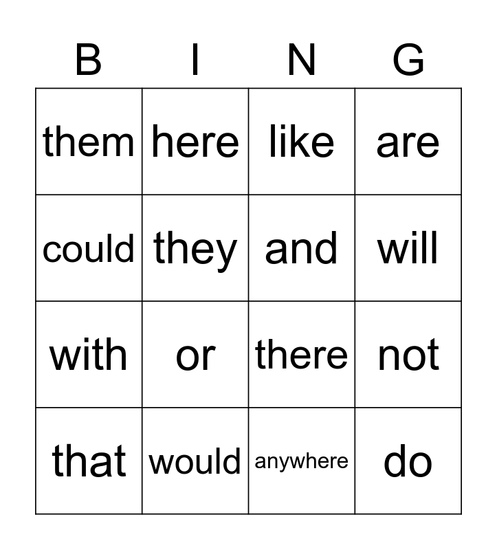 This bingo card has 16 words: would, not, like, them, with, here, there, anywhere, could, they, that, are, or, will, and and do.
