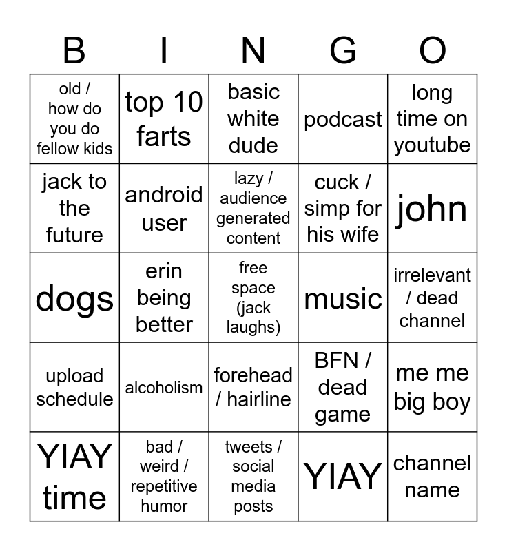 This bingo card has a free space and 26 words: forehead / hairline, YIAY, lazy / audience generated content, bad / weird / repetitive humor, long time on youtube, old / how do you do fellow kids, jack to the future, top 10 farts, irrelevant / dead channel, BFN / dead game, cuck / simp for his wife, dogs, me me big boy, YIAY time, erin being better, dead series (like YGS), podcast, upload schedule, basic white dude, channel name, john, tweets / social media posts, music, alcoholism, android user and birkenstocks (or clothes in general).