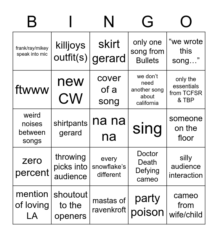 This bingo card has a free space and 24 words: throwing picks into audience, shoutout to the openers, cover of a song, mention of loving LA, “we wrote this song…”, frank/ray/mikey speak into mic, ftwww, killjoys outfit(s), sing, every snowflake’s different, we don’t need another song about california, weird noises between songs, Doctor Death Defying cameo, silly audience interaction, new CW, party poison, someone on the floor, skirt gerard, only the essentials from TCFSR & TBP, shirtpants gerard, cameo from wife/child, zero percent, only one song from Bullets and mastas of ravenkroft.