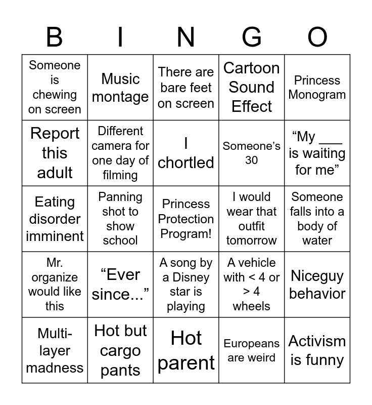 This bingo card has a free space and 24 words: “Ever since...”, Hot but cargo pants, I chortled, Multi-layer madness, Princess Monogram, Someone is chewing on screen, Report this adult, Music montage, I would wear that outfit tomorrow, A song by a Disney star is playing, Someone’s 30, Eating disorder imminent, A vehicle with < 4 or > 4 wheels, Niceguy behavior, Different camera for one day of filming, Europeans are weird, Someone falls into a body of water, There are bare feet on screen, “My ___ is waiting for me”, Panning shot to show school, Activism is funny, Mr. organize would like this, Cartoon Sound Effect and Hot parent.