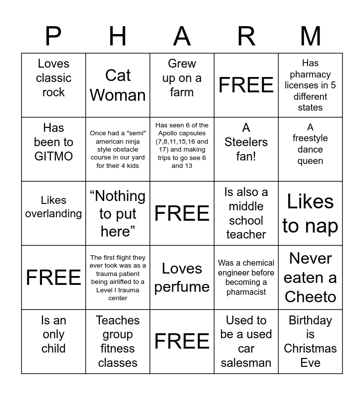 This bingo card has a free space and 24 words: The first flight they ever took was as a trauma patient being airlifted to a Level I trauma center, Teaches group fitness classes, Has seen 6 of the Apollo capsules (7,8,11,15,16 and 17) and making trips to go see 6 and 13, Is an only child, Has pharmacy licenses in 5 different states, Loves classic rock, Has been to GITMO, Cat Woman, Is also a middle school teacher, Loves perfume, A Steelers fan!, Likes overlanding, Was a chemical engineer before becoming a pharmacist, Never eaten a Cheeto, Once had a "semi" american ninja style obstacle course in our yard for their 4 kids, Used to be a used car salesman, Likes to nap, Grew up on a farm, A freestyle dance queen, “Nothing to put here”, Birthday is Christmas Eve, FREE, FREE and FREE.