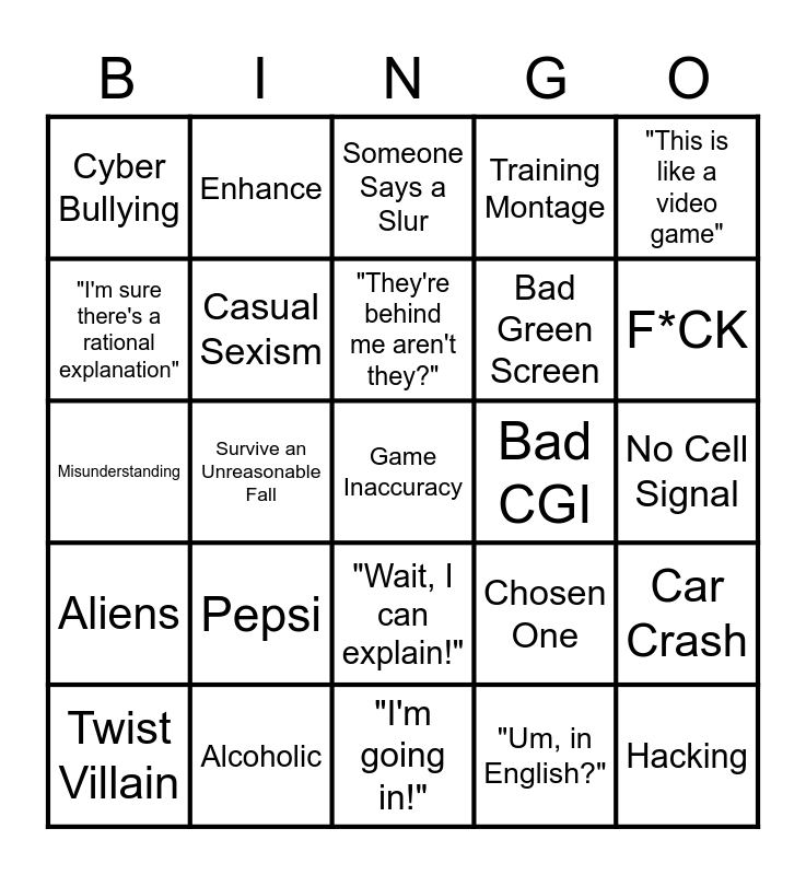 This bingo card has a free space and 38 words: Bad Audio Mixing, Dog Dies, Homophobia/Transphobia, Casual Sexism, Car Crash, Pepsi, "They're behind me aren't they?", Fart Joke, "This is like a video game", Bad Green Screen, Survive an Unreasonable Fall, Training Montage, Hacking, No Cell Signal, "I'm sure there's a rational explanation", Aliens, Mario Reference (can't be a mario movie), Someone Says a Slur, Saying the Movie Title, Bad CGI, Cyber Bullying, Alcoholic, F*CK, Twist Villain, Coca-cola, "I'm going in!", Jump Scare, Main Character is a Mass Murderer, Road Trip, Smoker, Dream Sequence, "Wait, I can explain!", "Um, in English?", Enhance, Bad Lighting, Chosen One, Misunderstanding and Bad Pixel Art.