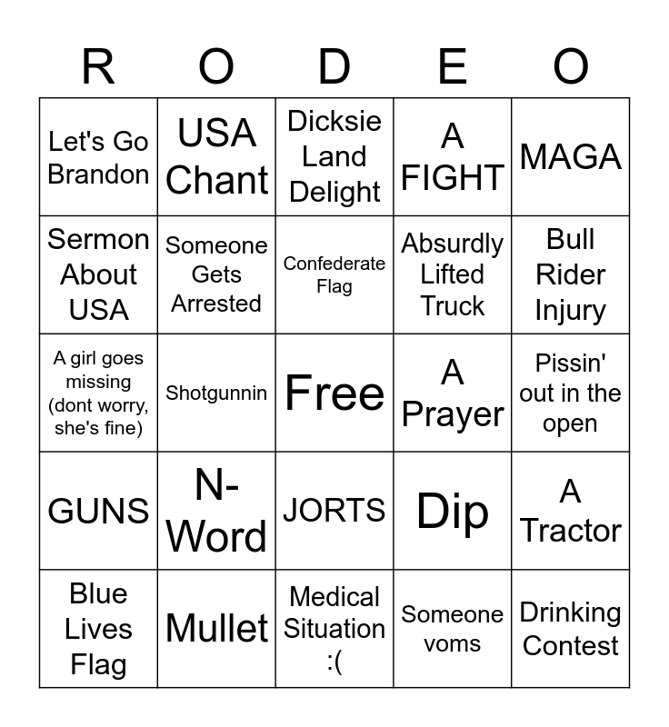 This bingo card has a free space and 24 words: N-Word, Mullet, Confederate Flag, Blue Lives Flag, MAGA, Let's Go Brandon, Sermon About USA, USA Chant, A Prayer, JORTS, Absurdly Lifted Truck, A girl goes missing (dont worry, she's fine), Dip, A Tractor, Someone Gets Arrested, Someone voms, Pissin' out in the open, Dicksie Land Delight, Bull Rider Injury, Shotgunnin, Drinking Contest, GUNS, A FIGHT and Medical Situation :(.