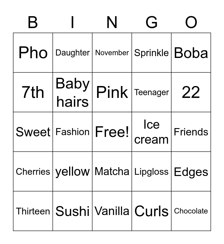 This bingo card has a free space and 24 words: yellow, Sushi, Pink, Thirteen, Boba, Pho, 7th, Daughter, Ice cream, Matcha, Teenager, Sweet, Lipgloss, Edges, Baby hairs, Curls, Friends, November, 22, Fashion, Chocolate, Cherries, Sprinkle and Vanilla.