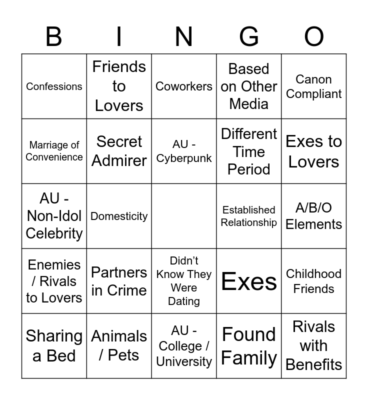 This bingo card has a free space and 70 words: 3+1 / 5+1 Times, A/B/O Elements, Angst, Angst and Fluff, Animals / Pets, Arranged Marriage, Based on Other Media, Blind Date, Canon Compliant, Celestial Beings, Childhood Friends, Childhood Sweethearts, Confessions, Coworkers, Dares, Domesticity, Didn’t Know They Were Dating, Different Time Period, Dreams, Enemies / Rivals to Lovers, Established Relationship, Exes, Exes to Lovers, Fake Dating, Feelings Realization, Fluff, Food / Cooking, Forbidden Love, Found Family, Friends With Benefits, Friends to Lovers, Handholding, Happy Ending, Hurt / Comfort, Hybrids, Idiots in Love, Kidfic, Magic, Marriage / Married Life / Weddings, Marriage of Convenience, Neighbors, Partners in Crime, Rivals with Benefits, Road Trip, Roommates, Secret Admirer, Sharing a Bed, Sickfic, Slice of Life, Slow Burn, Soulmates, Supernatural Elements, Trapped Together, AU - Bodyguard, AU - College / University, AU - Crime, AU - Cyberpunk, AU - Fantasy, AU - Modern, AU - Modern with Magic, AU - Non-Idol Celebrity, AU - Office, AU - Reincarnation, AU - Rock Band, AU - Royalty, AU - Shops, AU - Small Town, AU - Space, AU - Spies / Secret Agents and AU - Vampires.