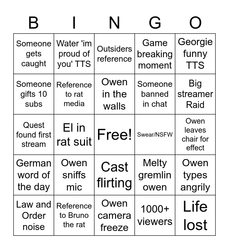 This bingo card has a free space and 24 words: Owen sniffs mic, Reference to Bruno the rat, Owen in the walls, Law and Order noise, Georgie funny TTS, Someone gets caught, Someone gifts 10 subs, Water 'im proud of you' TTS, Swear/NSFW, Cast flirting, Someone banned in chat, Quest found first stream, Melty gremlin owen, Owen types angrily, Reference to rat media, 1000+ viewers, Owen leaves chair for effect, Outsiders reference, Big streamer Raid, El in rat suit, Life lost, German word of the day, Game breaking moment and Owen camera freeze.